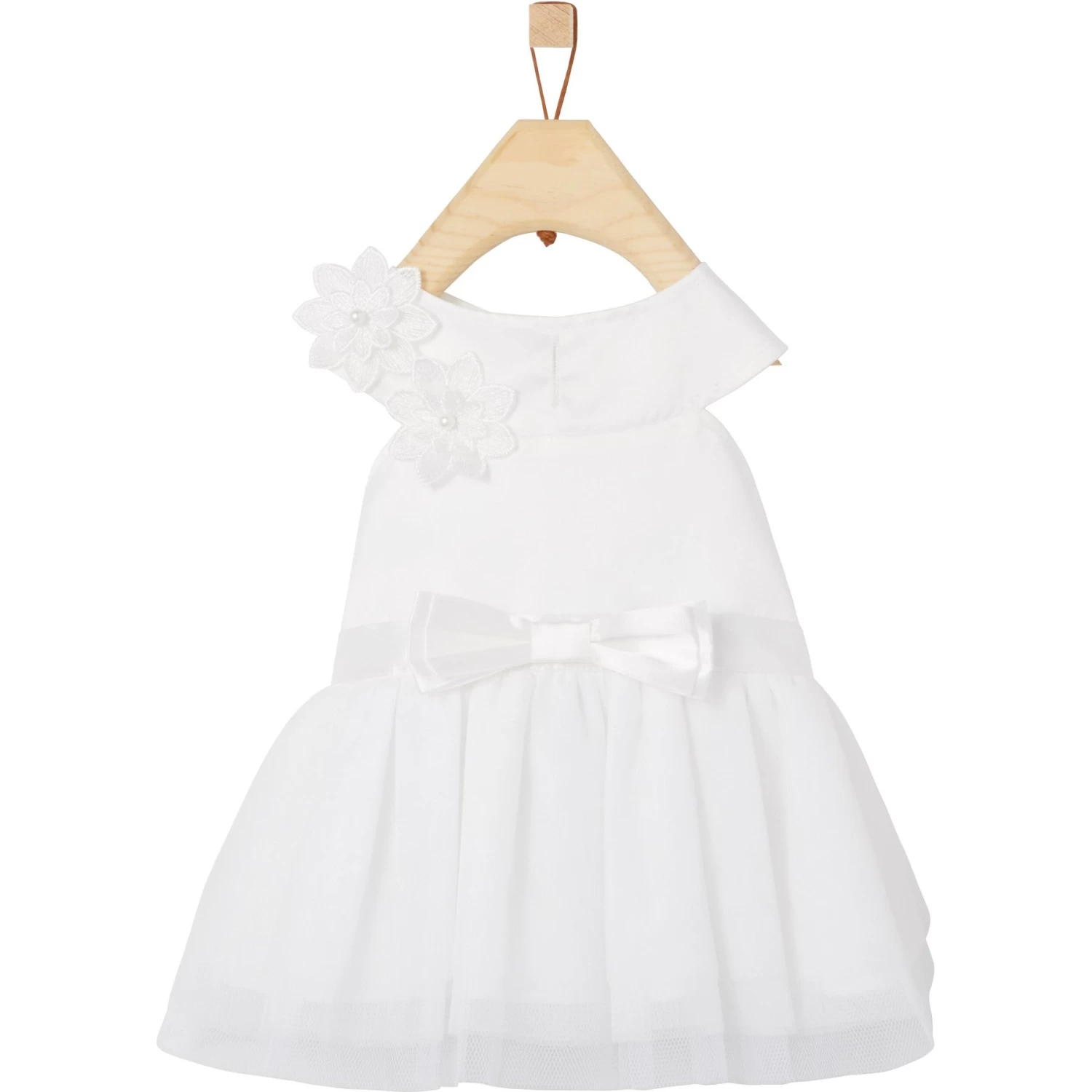- Lovely lace floral embellishments with faux pearl beading, layered tulle skirt, and satin bow add a touch of elegance.