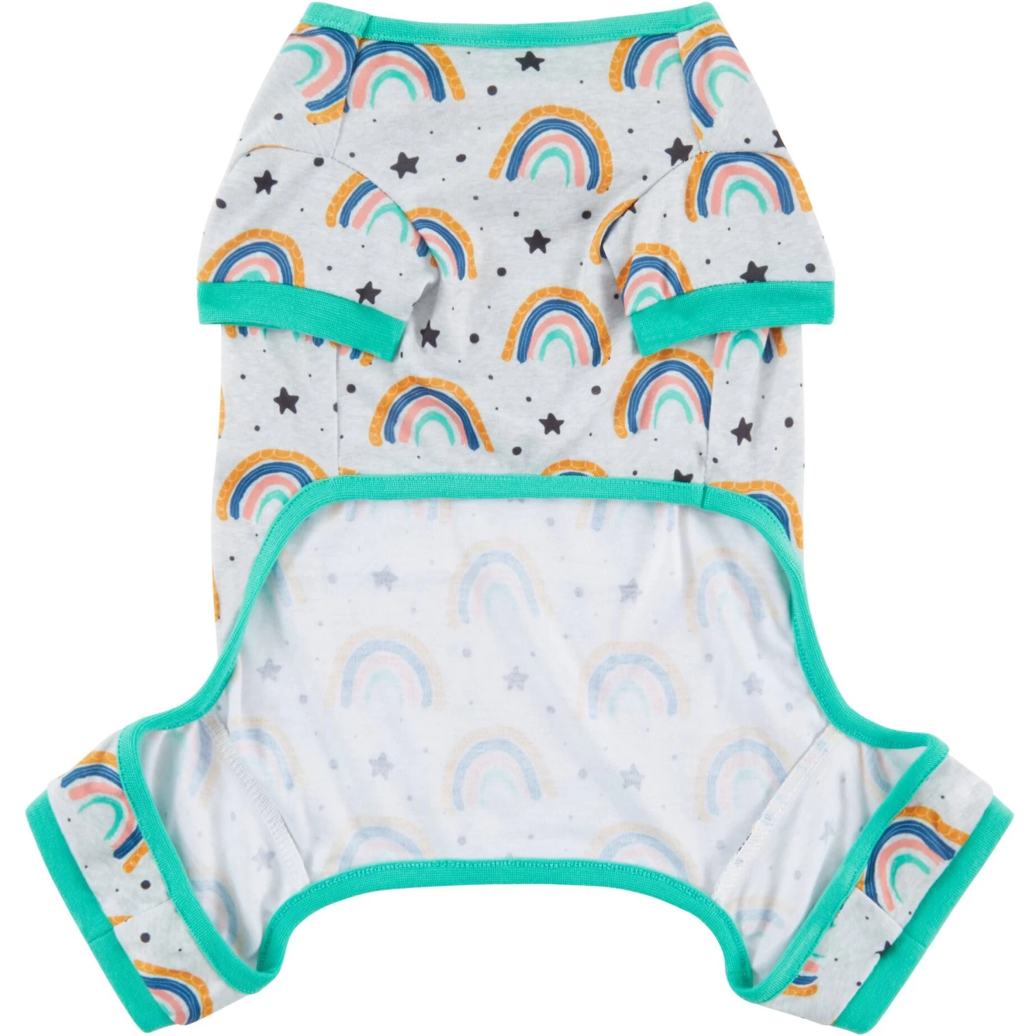 - Pajama has adorable rainbow graphics all over, making it a cute and awesome staple in your pet’s wardrobe.